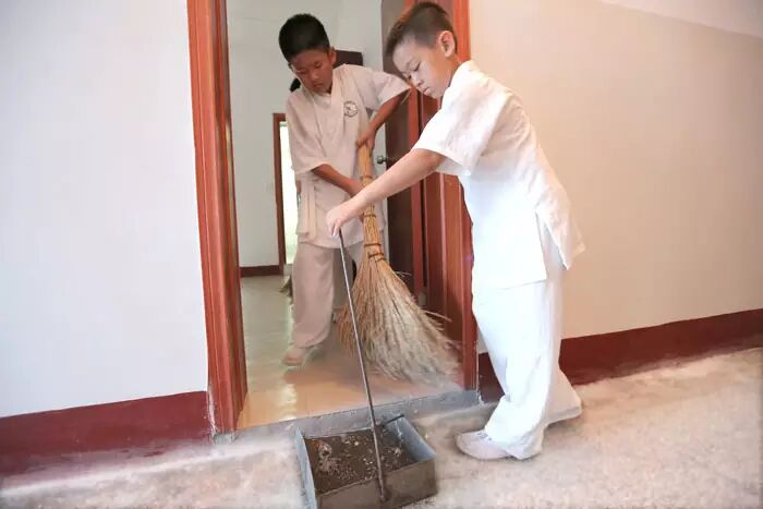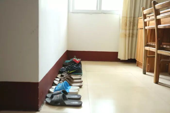 大一点的孩子主动分担拖地任务,小一点的就摆鞋子
