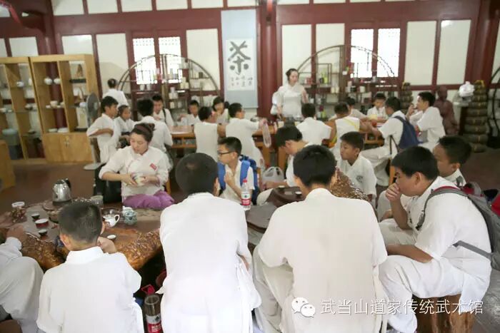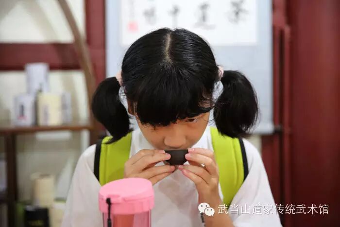 同学们寻得一道家茶艺表演处,艺师给大家品尝武当山本地所产“甘露茶”,其味甘醇适中,入口如沐山风,有道的味道……